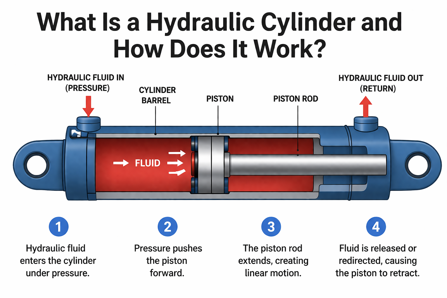 1. Hydraulic fluid (usually oil) is pumped into the cylinder through a port.