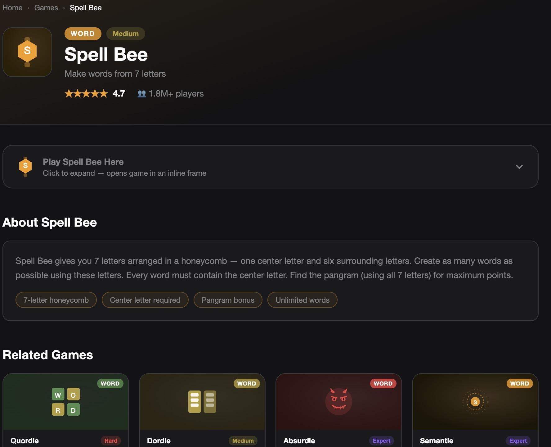 With over 1.8 million players and a 4.7-star rating, Spell Bee provides a complementary word challenge when you need a break from Wordle Unlimited. The platform continues to add new games, so there’s always something new to discover.