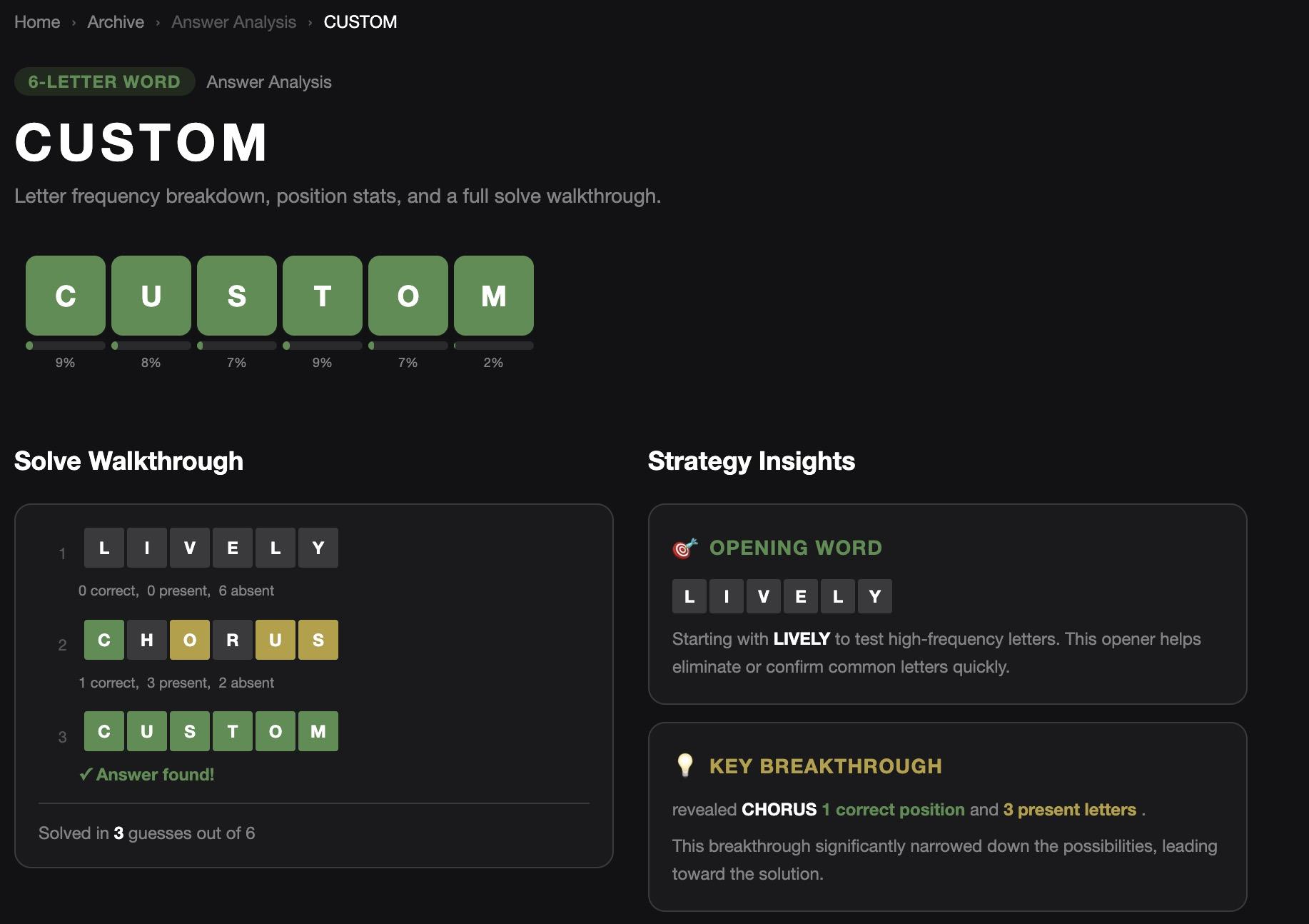 One of the platform’s standout features is its answer analysis tool. After solving a puzzle — or even if you’re stuck — you can visit pages like the “CHUNK” analysis to see a complete breakdown.