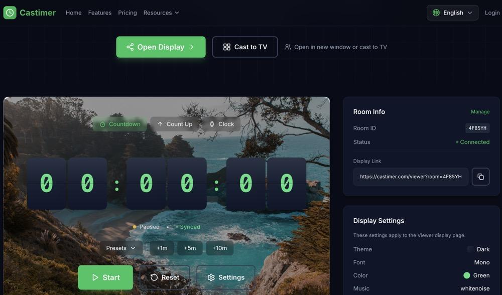 Visit https://castimer.com – no credit card required. Open the timer control page, create a room, and drag the viewer window to your external screen. That’s it.